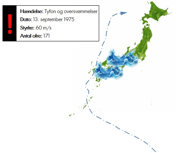 Dette førte selvsagt til oversvømmelser, da floder gik over deres breder, mens man i flere dele af landet oplevede jordskred, som begravede bygninger, mens endnu flere blev ødelagt af vandskader. Mens 1.669 bygninger blev totalskadet, så blev mere end 430.000 hjem oversvømmet, så over 300.000 mennesker kortvarigt blev hjemløse. De store mængder vand var ydermere med til at ødelægge veje, jernbaner, broer samt tusindvis af hektar landbrugsjord, som længe stod under vand, så folk i små landsbysamfund var isoleret i flere dage efter katastrofen. Mange måtte endda reddes væk fra deres tag med brug af helikoptere, fordi deres hjem stod under vand. I alt 171 mennesker endte dog med at omkomme, og dette var således den dødeligste tyfon i Japan i 10 år, mens ingen tyfon i Japan siden har krævet flere ofre.