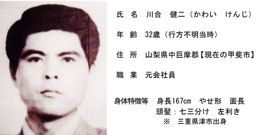Den 32-årige Kenji Kawai boede sammen med sine forældre i byen Ryuo i Yamanashi-præfekturet, hvor han den 4. april 1979 var på vej hjem fra arbejde, da han kom til at påkøre en kvinde og hendes to børn. De kom kun lettere til skade, men Kenji valgte ikke desto mindre at køre dem til undersøgelse på hospitalet, inden han vendte hjem, men eftersom han trods alt havde været involveret i en ulykke, modtog han senere på aftenen et opkald fra politiet, som gerne ville have ham til at aflægge forklaring. Umiddelbart herefter forlod Kenji dog sit hjem, hvilket blev sidste gang, han blev set i live.