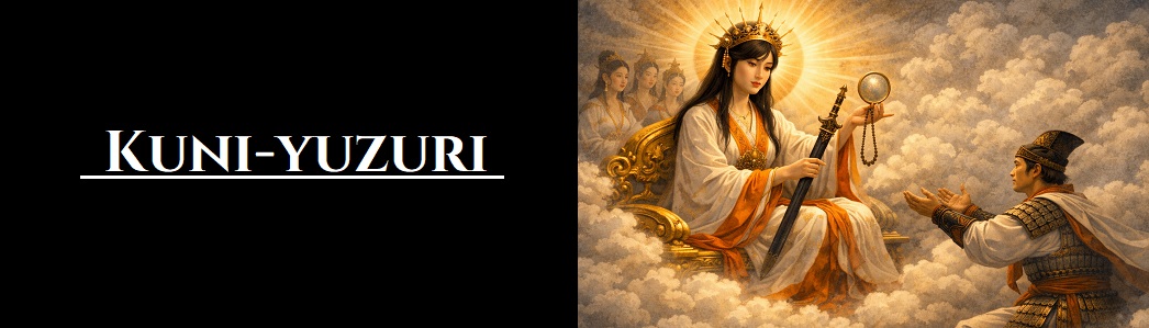 De himmelske guder valgte på et tidspunkt at overtage Jorden fra de jordiske guder for at skabe orden på denne, hvilket skete ved at udfordre Okuninushi, der dog valgte at overgive sig, da hans sønner blev overmandet af guden Takemikazuchi. Okuninushi trak sig herefter tilbage i en hinsides verden, hvorefter de himmelske guder overtog Jorden, hvilket helt nøjagtigt blev gjort ved, at solguden Amaterasu sendte sit barnebarn Ninigi ned for at regere over denne, hvilket foregik via broen Ame-no-ukihashi, så han ankom til det, der i dag er Miyazaki-præfekturet på Kyushu, hvor han slog sig ned ved at opføre et palads. Processen, hvor de jordiske guder blev overvundet af de himmelske guder, som herefter fik kontrol over Jorden, kaldes for Kuni-yuzuri og er et skelsættende øjeblik i japansk mytologi, idet Jorden var synonym for de japanske øer, som derfor ikke blot var skabt af guderne - en repræsentant for de himmelske guder valgte også at slå sig ned i Japan, så man hér havde en direkte forbindelse til den vigtigste af dem alle i form af solguden.