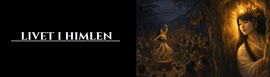 Havguden Susanoo var imidlertid misundelig på Amaterasu, og efter at have tabt en duel til hende valgte han at gå amok og rasere Himlen og Jorden i vrede, hvorved han også blev guden for stormvejr. Ødelæggelserne chokerede Amaterasu i en sådan grad, at hun valgte at gemme sig i en grotte kaldet Ama-no-Iwato, således at lyset i verden forsvandt. Hundredvis af guder forsamlede sig derfor uden for grotten, hvor de på desperat vis forsøgte at overtale Amaterasu til at komme ud. De holdt sågar en kæmpe fest for på den måde at lokke hende frem med lyden af morskab og latter, men det var først, da guden for daggry, Ame-no-Uzume, begyndte at danse, at Amaterasu besluttede sig for at kigge ud. Ame-no-Uzume havde imidlertid hængt et bronzespejl og et jadesmykke ved indgangen til grotten, så hér blev Amaterasu blændet af sin egen refleksion, hvilket fangede hendes opmærksomhed længe nok til, at de andre guder kunne nå at spærre grotten af og på den måde forhindre Amaterasu i at søge tilbage til den. Hun blev herefter overtalt til at vende tilbage til himlen og atter sætte lys i verden, mens Susanoo derimod blev forvist fra himlen, men han sluttede imidlertid fred med Amaterasu ved at overdrage hende et sværd, som han havde fundet i halen på den ottehovedet drage Yamata no Orochi efter at have nedlagt denne.