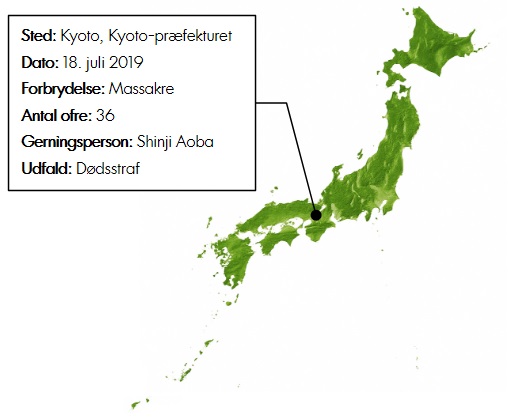 I 2019 mistede 36 mennesker livet i det, der officielt er Japans værste enemandsmassakre begået i efterkrigstiden, da animationsselskabet Kyoto Animation Studios blev udsat for et brandattentat. Dette fandt sted den 18. juli, hvor den 41-årige Shinji Aoba ankom til studiets hovedkontor i Kyoto med i alt 40 liter benzin, som han havde transporteret på en ladvogn fra en tankstation cirka en halv kilometer derfra. Klokken 10.30 begyndte han så at sprede benzinen ud ved indgangen, hvor nogle ansatte ligeledes blev overhældt, da de forsøgte at stoppe ham, før Shinji antændte benzinen med brug af en lighter. En enorm eksplosion brød således ud, hvorved der gik ild i både bygningen og de folk, som var til stede ved indgangen - heriblandt gerningsmanden, som måtte flygte ud på gaden, hvor han blev pågrebet af to ansatte, som formåede at flygte fra branden.