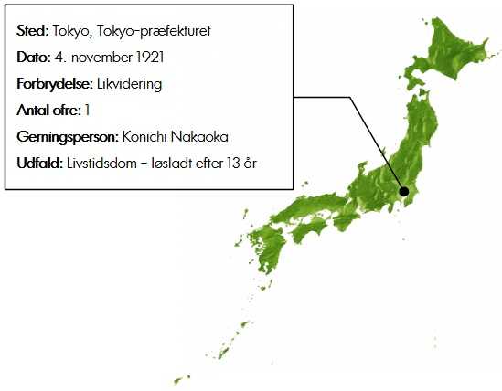 Hara Takashi blev i 1918 udpeget som Japans 10. premierminister, efter at hans forgænger, Terauchi Masatake, måtte træde af grundet folkelige uroligheder som følge af en drastisk prisstigning på ris. Hara nåede imidlertid kun at besidde titlen i 3 år, for den 4. november 1921 skulle han på visit i Kyoto, hvilket var en tur, der skulle foregå med tog med afgang fra Tokyo station, hvor han endte sine dage. Hér ankom Hara nemlig med en anden politiker ved navn Hida Takuji, men da de to nærmede sig billetlugen, blev den 65-årige Hara uden videre angrebet af en ung mand, der stak ham i brystet med en kniv, hvorved han kollapsede og forblødte til døde på stationen.
