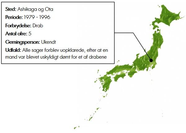 Fra 1979 og frem til 1996 blev 5 piger i alderen 4 til 8 år enten kidnappet eller dræbt inden for en radius af 20 kilometer i byerne Ota i Gunma-præfekturet og Ashikaga i Tochigi-præfekturet. I den første sag forsvandt den 5-årige Maya Fukushima nær sit hjem i Ashikaga fredag den 3. august 1979, og hendes nøgne lig blev da fundet efterladt i en rygsæk seks dage senere. Tasken tilhørte ikke Maya og var blevet solgt i Ashikaga, hvilket gav politiet mistanke om, at gerningsmanden bag drabet muligvis kunne være en lokal beboer. Sagen var dog stadig uopklaret i 1984, hvor endnu en 5-årig pige forsvandt i Ashikaga - denne gang Yumi Hasebe, mens hun lørdag den 17. november befandt sig i en pachinko-spillehal, men ingen vidste, hvad der var sket med hende, før også hendes lig blev fundet i 1986. Året efter, i 1987, var det så den 8-årige Tomoko Osawa, der forsvandt, da hun tirsdag den 15. september forlod sit hjem i Ota, og hendes lig blev først fundet i en flod året efter.