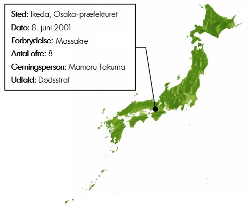 Den hidtil eneste skolemassakre i Japans historie fandt sted den 8. juni 2001 i byen Ikeda nord for Osaka, da den 37-årige Mamoru Takuma ankom til en grundskole under frikvarteret klokken 10.20, hvor han gik amok og stak alle ned, som han mødte på sin vej, med en medbragt køkkenkniv, som han netop havde købt. Mamoru vandrede fra klasseværelse til klasseværelse, hvor han målrettet gik efter børn, før han blev forsøgt standset af en mandlig lærer, som dog også blev stukket ned, så han dermed kunne fortsætte videre til et nyt klasseværelse, hvor han dog endelig blev overmandet af viceinspektøren og en anden lærer, så det 10 minutter lange blodbad blev bragt til en ende.