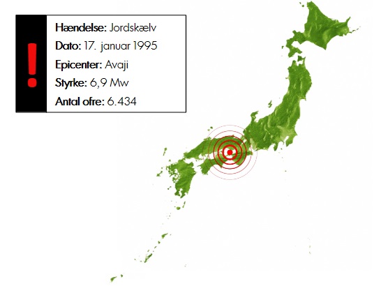 Den 17. januar 1995 klokken 5.46 blev Hyogo-præfekturet ramt af et jordskælv, hvis epicenter lå blot 20 kilometer fra storbyen Kobe under øen Avaji. Jordskælvet målte 6,9 på momentmagnitudeskalaen og varede i 20 sekunder, men fordi det var et såkaldt indlandsjordskælv, der opstod i et tætbefolket område, så endte 6.434 mennesker med at miste livet, og mere end en tredjedel af ofrene kom fra Kobe, hvor man oplevede omfattende ødelæggelser på bygninger og infrastruktur. I det værst ramte område var hver femte bygning kollapset, hvilket primært drejede sig om bygninger, der var opført før 1981, hvor man var gået over til at anvende en byggestandard, som netop skulle forhindre skader under jordskælv. Mange ældre huse faldt sammen, og det var sådan, de fleste endte med at miste livet, da de simpelthen blev mast ihjel eller fanget i ruiner, fordi mange stadig lå i deres senge og sov.