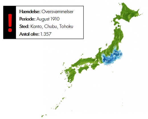Den 30. september 1917 blev det østlige Japan ramt af voldsomme oversvømmelser, der endte med at koste 1301 mennesker livet. Oversvømmelserne skyldtes en tyfon, der havde ramt Phillipenerne i dagene forinden, hvilket førte til en kraftig storm over Stillehavet, der ramte den japanske kyst på samme tid, som tidevandet begyndte at stige natten til den 30. september. Dette fik vandstanden i flere havnebyer til at stige med flere meter, ligesom floder løb over deres breder i både Chubu-regionen, Kanto-regionen og Tohoku-regionen. Værst gik det ud over Tokyo, hvor mere end 500 mennesker mistede livet - primært fordi Sumida-floden løb over sine breder og satte flere kvarterer under vand, hvilket kom bag på mange, så de ikke havde mulighed for at flygte, før det var for sent. På dette tidspunkt var det nemlig ikke så almindeligt, at japanerne kunne svømme.