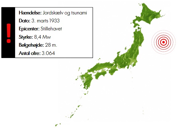 Den 3. marts 1933 klokken 2.30 opstod et jordskælv 200 kilometer fra Honshus nordøstlige kyst, der er kendt som Sanriku. Jordskælvet blev målt til 8,4 på momentmagnitudeskalaen, men førte dog ikke til store ødelæggelser, idet det ikke havde en voldsom effekt på land. Eftersom epicentret lå 20 km. under havoverfladen, så resulterede jordskælvet imidlertid i en tsunami, der ramte kysten omkring en halv time senere. Selvom mange havde nået at evakuere, så var det midt om natten, og man kunne derfor ikke se bølgen, der nåede en højde på 28,7 meter i byen Ofunato i Iwate-præfekturet, som blev hårdest medtaget. Miyagi- og Aomori-præfekturet samt Hokkaido blev ligeledes ramt af tsunamien, der lagde omkring 5000 hjem i ruiner, mens over 2000 andre bygninger blev beskadiget. Det endelige dødstal endte på 1522, mens yderligere 1542 aldrig blev fundet, og det formodes derfor, at i alt 3064 mennesker omkom. Tsunamien nåede ligeledes til Hawaii, hvor den dog havde mistet pusten og derfor kun førte til begrænsede skader.