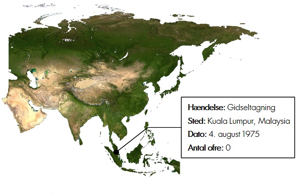Bygningen tilhørende American Insurance Associates (AIA) i Kuala Lumpur i Malaysia husede i 1975 den amerikanske og svenske ambassade, da 5 bevæbnede mænd fra Japans Røde Hær stormede bygningen den 4. august og tog 53 mennesker som gidsler - heriblandt børn af de ansatte. Disse var dog ikke andet end uskyldige brikker i en aktion på sikker afstand fra de japanske myndigheder, som angrebet egentlig var rettet mod, for formålet med dette var nemlig, at terroristerne forlangte, at man i Japan skulle løslade syv af deres kolleger, som på dette tidspunkt befandt sig i Japans varetægt, ellers truede de med at dræbe samtlige gidsler.