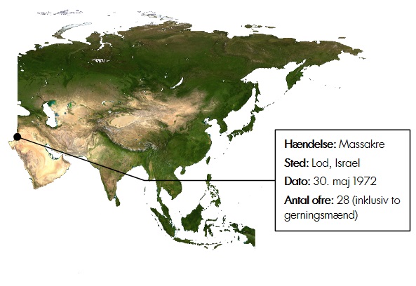 Denne fandt sted den 30. maj 1972, hvor tre mandlige medlemmer af Japans Røde Hær blev sendt til Lod Lufthavn for at begå et terrorangreb på vegne af Folkefronten til Palæstinas befrielse, som havde rekrutteret dem til at kæmpe på deres side i konflikten mellem Israel og Palæstina, selvom japanerne som sådan ingen personlig interesse havde i denne. Men eftersom de delte revolutionære ideologier med mange mellemøstlige oprørsgrupper, så var det også i Mellemøsten, flere medlemmer af Japans Røde Hær befandt sig for at modtage kamptræning. De var derfor også nemme at anvende som brikker i konflikter, de slet ikke var en del af, for det var først og fremmest et strategisk valg at gøre brug af japanere til at udføre angrebet i Lod Lufthavn, idet sikkerhedspersonalet i denne primært fokuserede på truslen fra palæstinensere.