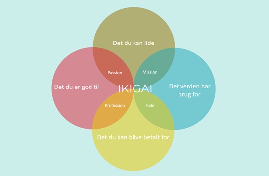 Dette diagram kombinerer nemlig fire aspekter: mission, profession, kald og passion, der tilsammen giver en mening i tilværelsen - altså ikigai. Men disse kan alene være svære at tilegne sig eller se for sig, så de er selv resultater af fire andre aspekter, som er nemmere at identificere og tage udgangspunkt i: det man kan lide, det verden har brug for, det man kan blive betalt for, og det man er god til. Det man kan lide kan fremkalde en mission eller en passion, når det kombineres med det man er god til, og det, som verden har brug for, hvilket derimod kan fremkalde en profession eller et kald, når det kombineres med det, man kan blive betalt for.