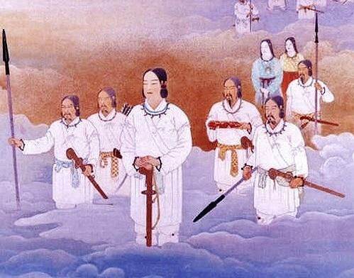 Ninigi bragte blandt andet de tre royale skatte med sig (et spejl, et sværd og et smykke), som siden er gået i arv i kejserslægten som et bevis på dennes forbindelse til guderne. Ninigi er selv barnebarn til solguden Amaterasu, der anses for at være en af de vigtigste guder i shintoismen, og det var da også hende, der bad ham om at tage til Jorden, efter at de himmelske guder havde overvundet Okuninushi, der var lederen af de jordiske guder. Denne begivenhed er kendt som Kuni-yuzuri, der i al sin enkelthed er betegnelsen for, hvordan de himmelske guder overtog kontrollen over Jorden, der var kendt som Ashihara no Nakatsukuni, hvilket egentlig var det japanske ørige, der ifølge den japanske mytologi blev skabt af guderne Izanagi og Izanami, og nærmere betegnet ankom Ninigi til Miyazaki-præfekturetKyushu, hvor den japanske kejserlægt således tog sin begyndelse.