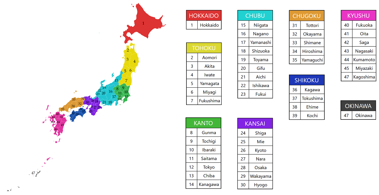 Japan kan inddeles i regioner, hvilket drejer sig om Hokkaido, Shikoku, Kyushu og Ryukyu-øerne, mens Honshu kan opdeles i Tohoku, Kanto, Chubu, Chugoku og Kansai, der også er kendt som Kinki. Officielt er Japan dog opdelt i 47 administrative enheder kaldet præfekturer, der på japansk er kendt som todofuken. Blandt disse optræder Hokkaido som et enkelt præfektur, mens de fire andre hovedøer derimod er opdelt i præfekturer, mens de sydlige Ryukyu-øer er slået sammen i et enkelt præfektur. De nordlige Ryukyu-øer kaldet Amami-øerne hører derimod til Kagoshima-præfekturet på Kysuhu, hvilket skyldes, at den amerikanske okkupation efter Anden Verdenskrig fortsatte på Ryukyu-øerne, efter at denne ophørte på hovedøerne i 1952. Året efter valgte man så at overdrage Amami-øerne til Japan, hvor disse blev administrativt tilknyttet Kagoshima-præfekturet, mens de sydlige Ryukyu-øer blev omdannet til Okinawa-præfekturet, da den amerikanske okkupation af disse endte i 1972.