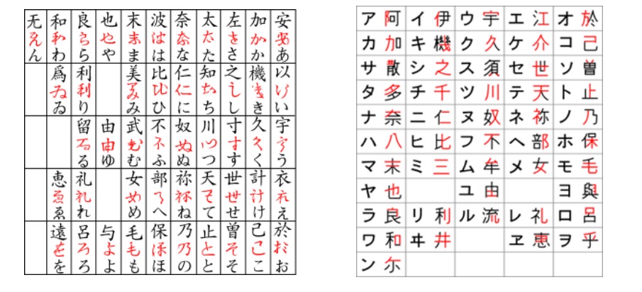 Her ses en oversigt over, hvilke kanji der har ført til udviklingen af henholdsvis hiragana og katakana: